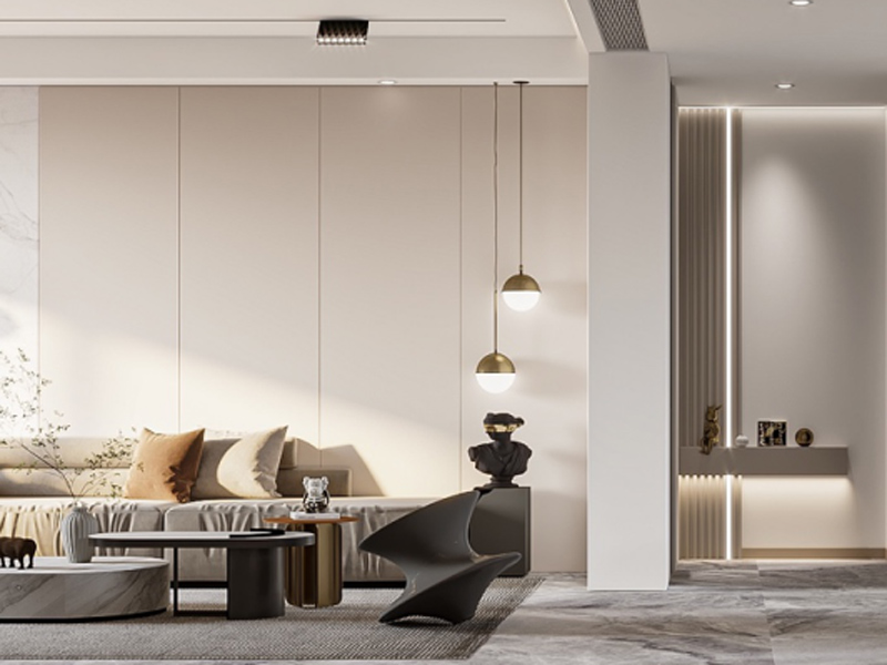 客厅区域背景墙采用拼接设计,营造出自然和谐的韵律感,搭配无主灯设计,将客厅空间的大气开阔展现得恰到好处。