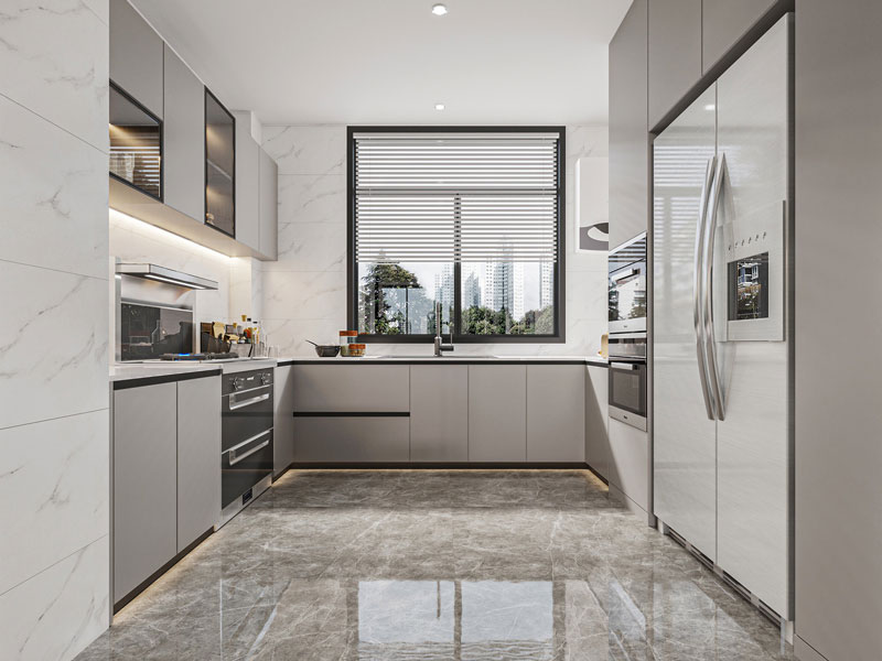 厨房采用“U”型的空间布局,提升空间利用率,满足了区域收纳需求,简洁的色调搭配使整体空间更雅致。