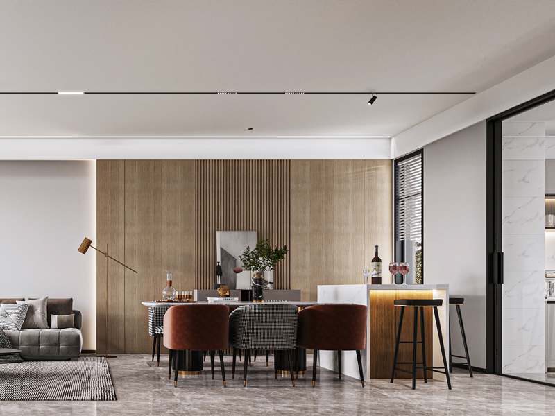 餐厅区域岛台一体化设计增添操作台面,使用更便捷,原木材质背景墙,提升区域自然氛围与层次。